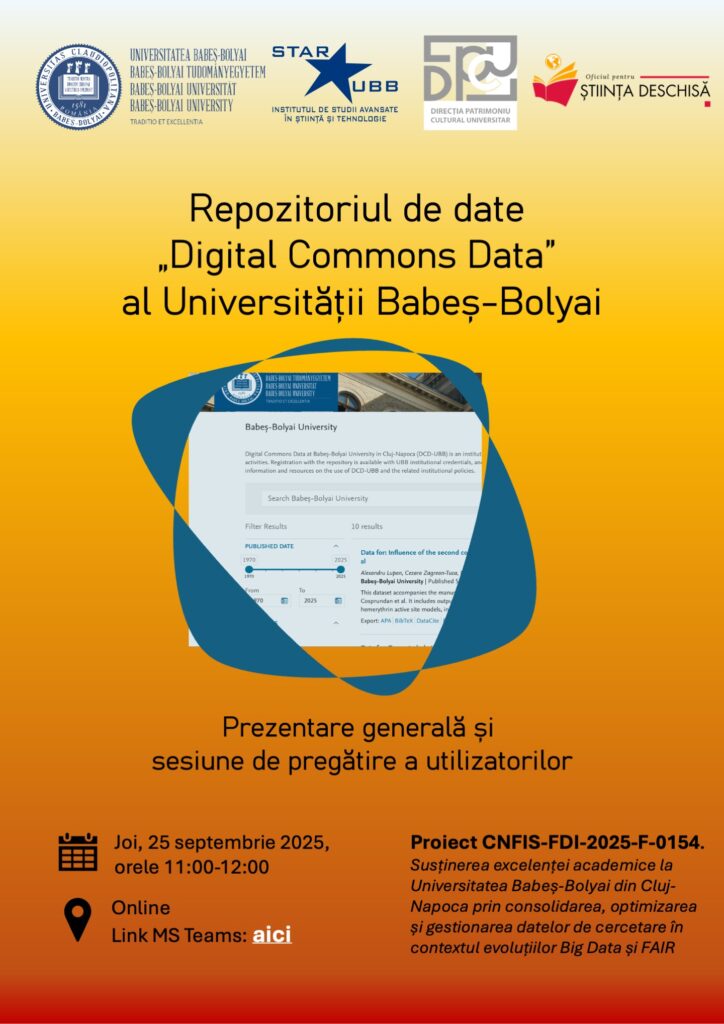 Sesiune de pregătire este realizată în cadrul proiectului CNFIS-FDI-2025-F-0154. Susținerea excelenței academice la Universitatea Babeș-Bolyai din Cluj-Napoca prin consolidarea, optimizarea și gestionarea datelor de cercetare în contextul evoluțiilor Big Data și FAIR și deschide seria evenimentelor de promovare și pregătire a comunității UBB în vederea utilizării repozitoriului de date „Digital Commons Data” – UBB.